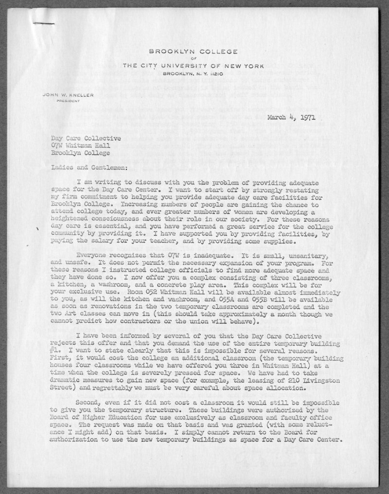 This letter from Brooklyn College President John Kneller demonstrates the level of engagement that feminist faculty and staff organizers of the Day Care Collective demanded from university leadership as they experienced dismissal after dismissal. While President Kneller proposed a temporary home for the day care program, he was forced to contend with activists who continued to demand adequate, safe childcare for children whose parents worked or studied at Brooklyn College.