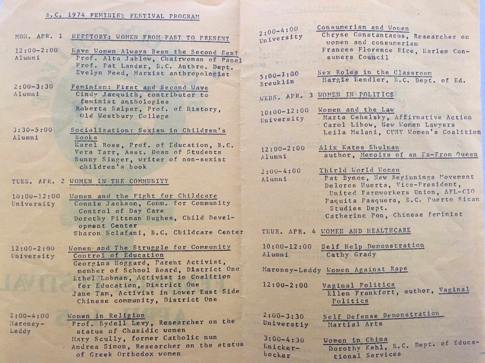These two versions of a program for a feminist festival held in the early years of the Brooklyn College Women's Studies Program showcase the interdisciplinary concerns of the program, as well as their commitment to an active relationship between feminist scholarship and activism. Speakers and workshops for the festival range from self-defense demonstrations to feminist arts, poetry, and film They also address activism in education, sexual violence, abortion rights, women's health, sexual orientation, and women's labor, including academics' lawsuits against sex discrimination. Presenters of note are Dolores Huerta of the farmworkers movement, Lilia Melani of the CUNY Women's Coalition lawsuit against sex discrimination, and Pat Lander, a long time co-coordinator of the Women's Studies Program at Brooklyn College.
