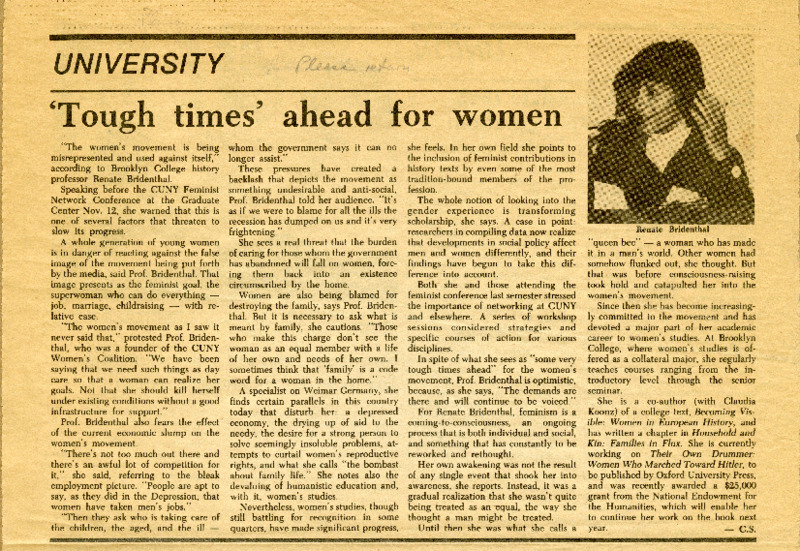 Brooklyn College Women's Studies Program co-founder and professor of history, Renate Bridenthal, is featured in this Clarion article, which is the PSC-CUNY faculty union publication. The Clarion covered a speech Bridenthal gave at the CUNY Feminist Network Conference at the Graduate Center, in which she spoke about the cultural backlash against the feminist movement and predicted that women would experience disproportionate effects of the economic downturn in the early 1980s. However, Bridenthal is sure to note victories and strides made within feminist scholarship, such as the Women's Studies Program at Brooklyn College.