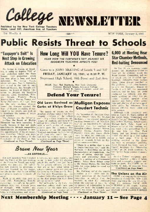 The cover of this issue of the College Newsletter, a publication of the New York College Teachers Union, includes several articles regarding the then ongoing Rapp-Coudert hearings of the early 1940s. They report on mass meetings with thousands of members of other local unions that went unreported in the New York Times. The Rapp-Coudert Committee was a New York State initiative organized in June 1940 to investigate and identify "subversive activities" and persons in New York's public schools and colleges. Several teachers' unions were targeted in the initial stages of the state's investigation as their membership rolls comprised progressive activists, many of whom had Communist ties. City College, in particular, became a target of the committee with dozens of faculty and staff called to public and private hearings.