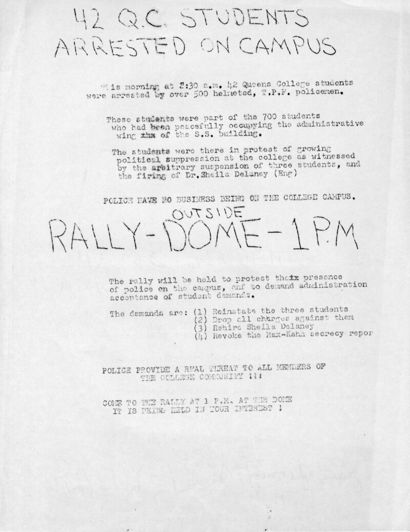 Ad Hoc Committee to End Political Suppression. Letter. “42 QC Students Arrested on Campus.”, CUNY DIGITAL HISTORY ARCHIVE, accessed March 10, 2026, https://stephenz.tailc22a4b.ts.net/s/cdha/item/899