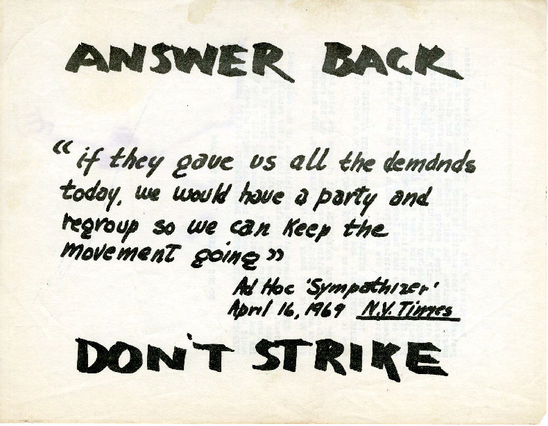 Another anti-protest flier, this one again calls for students to attend class instead of striking. It features a quote from an "Ad Hoc 'Sympathizer'," a member of the group largely responsible for much of the ongoing disruption on campus.