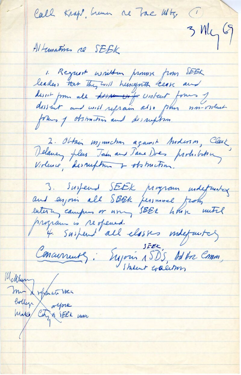 These handwritten notes were taken during a Faculty Committee meeting held on May 3, 1969. A large segment of the meeting was devoted to handling issues with Queens College's SEEK program. Short for "Search for Education, Elevation, and Knowledge," SEEK was established in 1966 as a CUNY-wide program to assist disadvantaged students who might otherwise lack the opportunity to study at a four-year college. At Queens, much debate surrounded the program by 1969 as many black students in the program argued for greater autonomy and demanded significant changes to the program structure including student control of faculty hiring. At one point, students smashed windows and overturned card catalogues. Their actions, which contributed to the temporary closure of the college, made the front page of the New York Times on May 3 including a large photograph above the centerfold.Occuring simultaneously with the SEEK protests were additional unrelated efforts taken by the Ad Hoc Committee that saw the student occupation of administrative buildings and offices. In choosing to close the school for the second time in 1969, President Joseph P. McMurray declared, "No meaningful educational program can go on in this kind of atmosphere." Queens joined City College and Brooklyn College in temporarily shutting down because of student unrest. By May 3, of the four major CUNY schools, only Hunter remained open.