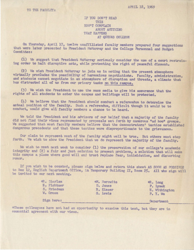 Ad Hoc Faculty Committee. Letter. “‘To the Faculty: ’If You Don’t Read This, Don’t Complain About Anything That Happens at Queens College’’.”, CUNY DIGITAL HISTORY ARCHIVE, accessed March 10, 2026, https://stephenz.tailc22a4b.ts.net/s/cdha/item/970