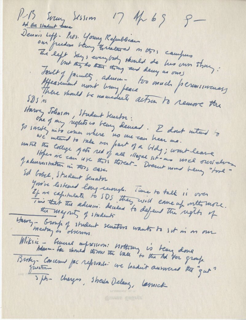 These handwritten notes, taken by an unknown faculty member, are from the second session of the Personnel and Budget (P&B) meeting held on April 17, 1969. They give an account of the happenings of the meeting, beginning with summarized statements from right-leaning members of the student population including the president of the college's Young Republicans club.