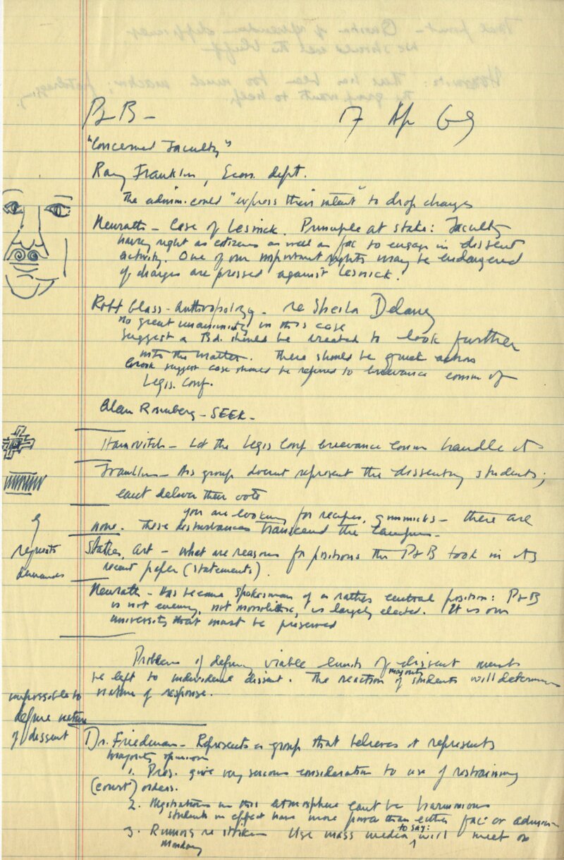 These handwritten notes, taken by an unknown faculty member, are from the first session of the Personnel and Budget (P&B) meeting held on April 17, 1969. They give an account of the happenings of the meeting, beginning with summarized statements from members of the "Concerned Faculty" group.