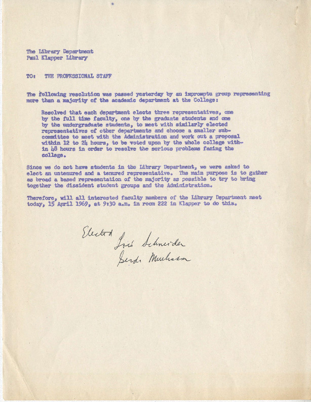 This letter was issued to the professional staff in the Paul Klapper Library at Queens College on April 15, 1969. Three days earlier, the college's Biology Caucus proposed the creation of an inter-departmental committee composed of faculty and students from each department in the college. As the notice states, however, the library department did not have students and so it was requested they provide additional staff representation. The committee, it was hoped, was to be convened in effort to rectify the ongoing student showdown with campus administration that saw regular demonstrations on campus between March and May 1969.