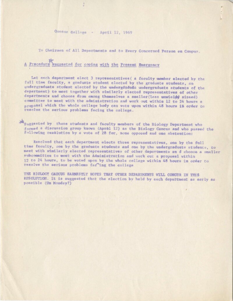 This notice, created by Queens College's Biology Caucus, proposed the creation of an interdepartmental, college-wide committee comprised of full-time faculty, graduate students, and undergraduates. As the document notes, it was the hope that this committee might arrive at a satisfactory decision to resolve the college's ongoing crisis between students and the administration. Student demonstrations and sit-ins were regularly planned between March and May 1969, with tensions on campus remaining particularly acute during that period.