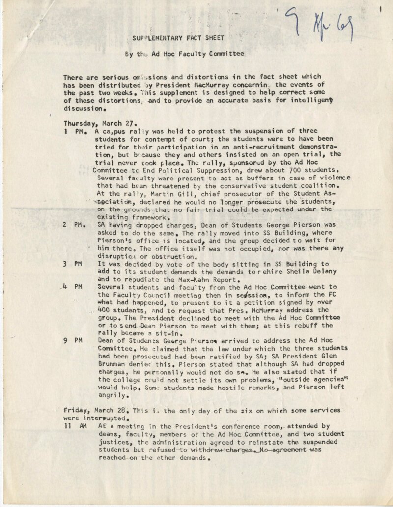 This is a fact sheet that was prepared by the Ad Hoc Committee in attempt to correct, what they perceived to be, a distorted version of events presented by Queens College President John P. McMurray and other college administration in the preceding days. The events in question involved the particulars of student protests and demonstrations on campus in March and April 1969. This sheet covers the timeframe of March 27 to April 1, during which time students occupied the Social Sciences Building on campus in protest of the college's treatment of three students from a separate incident earlier in March.