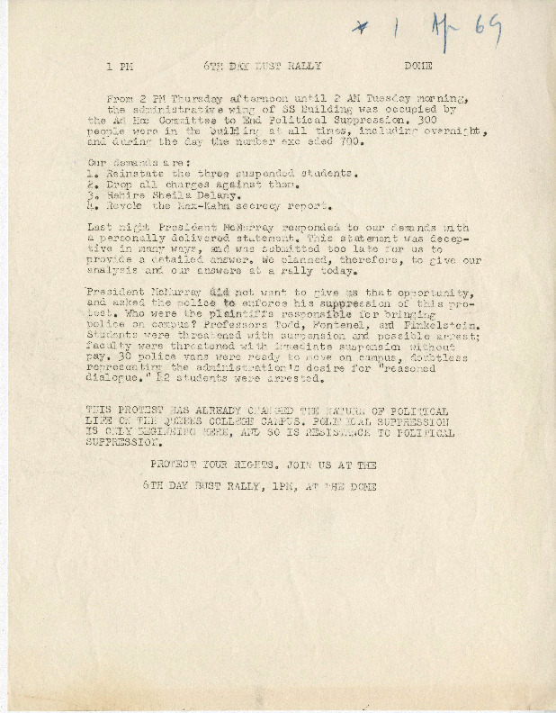 Created by the Ad Hoc Committee (to End Political Suppression), an activist student group at Queens College, this flier calls for a rally at 1pm on April 1, 1969 where the group would issue its reply to Queens College President McMurray's statement from the prior night. At the time of the flier's publication, the Ad Hoc Committee was leading a protest on campus that included the takeover of the Social Sciences building. In fact, in the early morning of April 1, 38 were arrested after police were tasked with clearing out the building. Student protest would continue, however, through April into May.