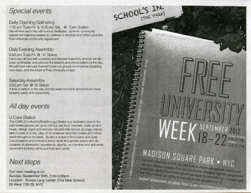 This workshops pamphlet for "Free University Week," September 18-22, 2012, in Madison Square Park, Manhattan, NY announced a variety of topics ranging from Radical Potentiality: Recreating Academic Practices in the Humanities to a workshop on Yoga.