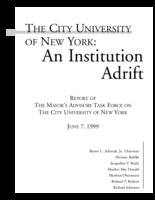 The Mayor's Advisory Task Force Report: The City University of New York: An Institution Adrift The Mayor's Advisory Task Force on the City University of New York issued its report, The City University of New York: An Institution Adrift, to Mayor Rudolph W. Giuliani on June 7, 1999. Over the course of their investigation, they reported that they examined CUNY's budgeting, funding and financial management. They reviewed the university's governance processes as well as its Open Admissions policies and remedial education programs. They examined the relationship between the public schools and the need for remedial education at CUNY. Lastly, they reported on ways in which third parties could provide remedial education to CUNY students. -